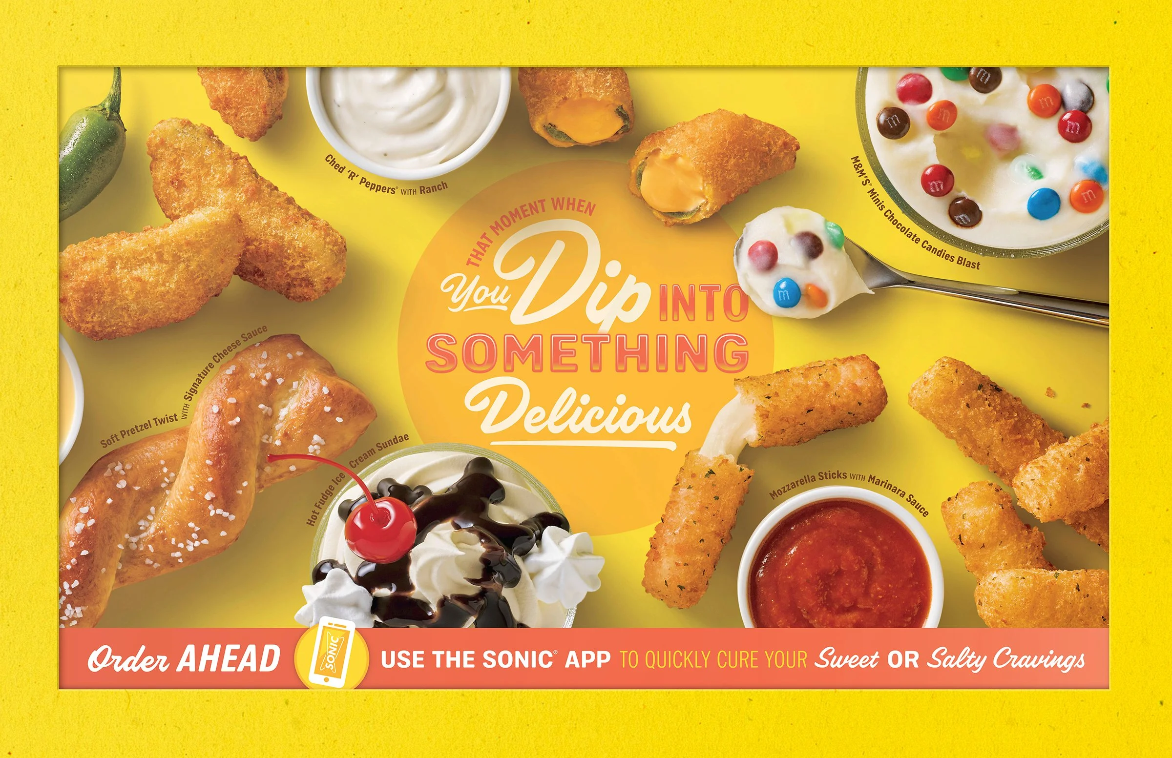 Sonic’s passenger menus are redesigned seasonally to showcase both new and favorite menu items. New target audience insights and strategy led us to a concept highlighting the unique moments guests have when experiencing Sonic. We made the campaign hyper-relevant by incorporating social media vernacular and starting each board with “That moment when …”, paid off with copy highlighting a delightful Sonic experience. An entree, drink, and snack board were all created by our team, each using one of Sonic’s main brand colors.